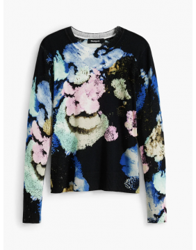 This lovely lightweight sweater is a Desigual collaboration with Christian Lacroix. Featuring an abstract waterlily design in soft pastel hues on a black background.