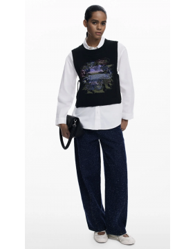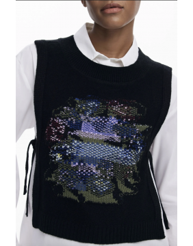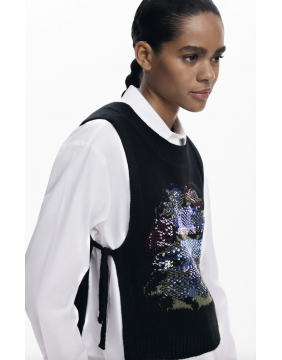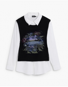 A classic white cotton shirt with an abstract floral, removable knitted tie-side tank top. A really fun and versatile piece that you can mix and match to your hearts content!