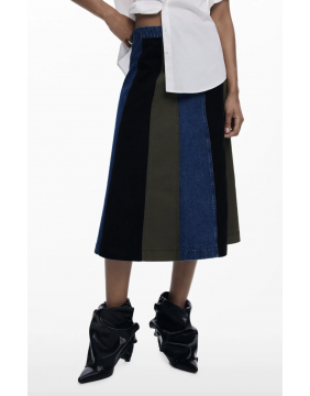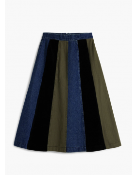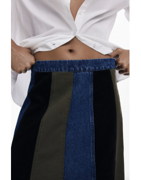 A denim skirt Desigual style! A flattering A-line shape with panels of denim, khaki fabric and black cord, finished with a denim waistband and fastened via a zipper.