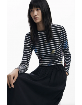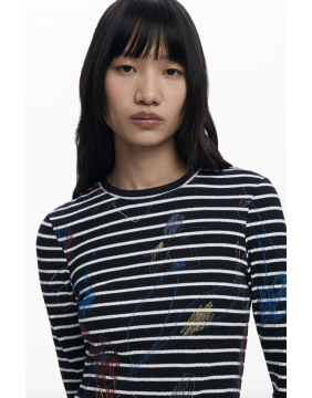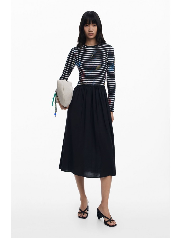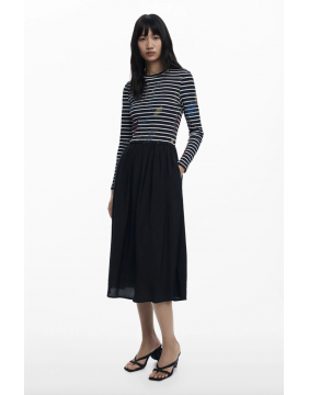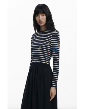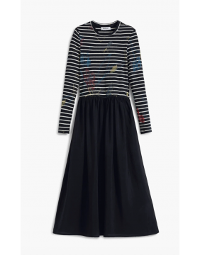 This fab frock is such an easy wear. The black and white striped knitted top features an overlay of a coloured abstract floral drawing, and the bottom is a plain black cotton poplin skirt...with pockets!